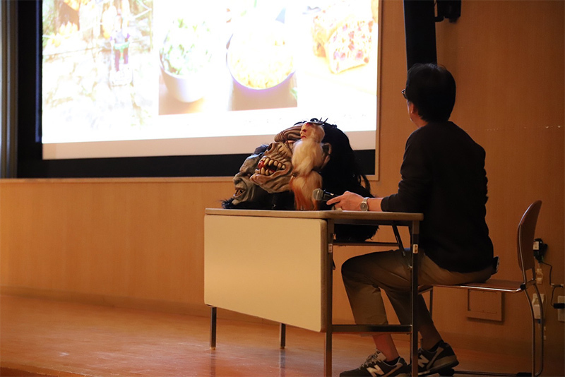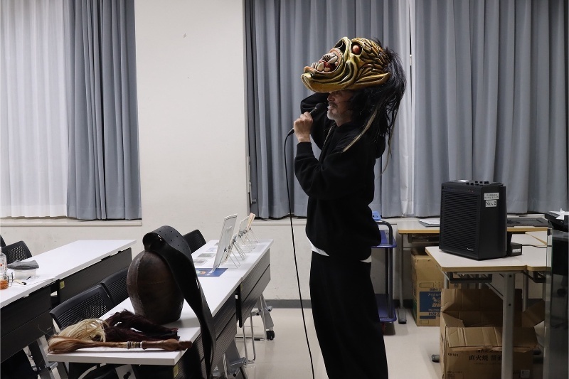 授業ではクランプスのほかに多くの漫画やゲームに影響を与えてきた北欧神話やハロウィンの由来であるアイルランド民話を紹介し、クリエイティブな世界との繋がりについて考察しました。また日本における昨今の鬼ブームについても触れました。後半は現地オーストリアで撮影したクランプスパレードの映像とともに、吉田氏からお借りした仮面、鞭、グローブ、カウベルを紹介。その大きさと重厚感から日本と海外の表現の違いがはっきりと伝わりました。最後に学生と教員が仮面を被り、カウベルを持って教室内をパレードする実演を行いました。クランプスが持つ迫力を肌で感じる貴重な時間となりました。