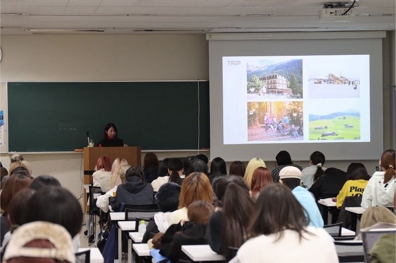 教室に入るとクランプスの仮面がお出迎え。教室の大スクリーンに現地のクランプスパレードの映像が流れる迫力の演出で、授業開始前から学生たちも大騒ぎでした。オーストリアのザルツブルク、リーエンツ、ドイツのミュンヘンにおけるパレードを中心に紹介しながら、クランプスの歴史、衣装のディティール、決まった時期に街にやって来る意味について説明しました。当初はスクリーンに映るクランプスの姿を怖がっていた学生も、その風習の意味を知ることで次第に関心を寄せていました。現地で使われていた本物の仮面を一点ずつ紹介し、「全て職人が作った一点ものである」ことに多くの学生が驚いていました。授業終わりには仮面の周りに集まり、仮面の内部の構造や表情の掘り方までまじまじと観察する姿が印象的でした。新たな文化との出会いが学生の創作意欲を掻き立てる時間となりました。