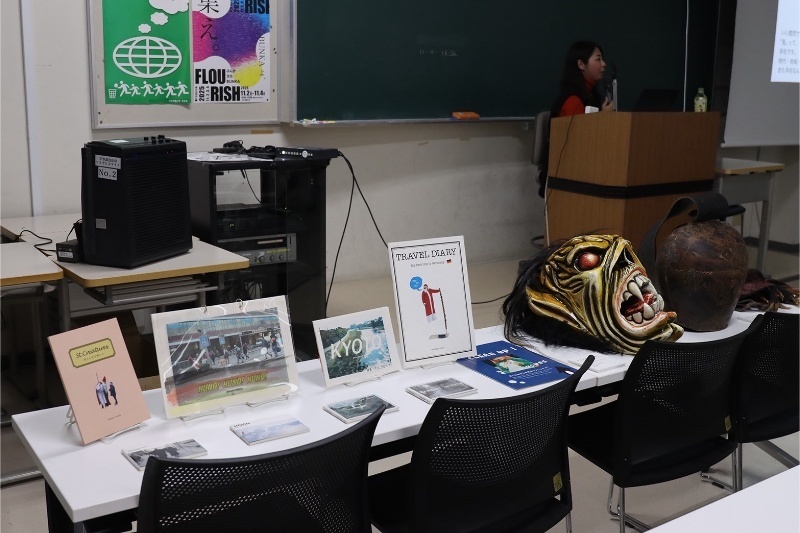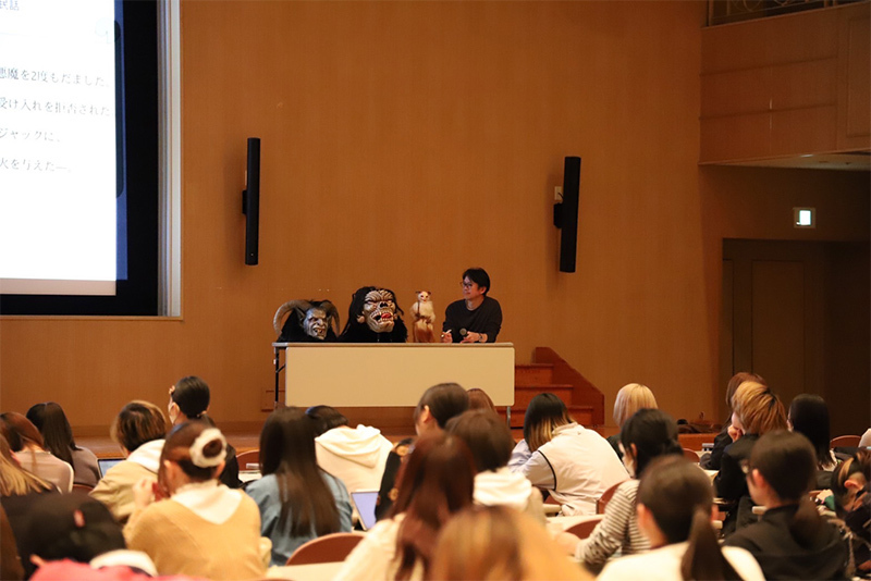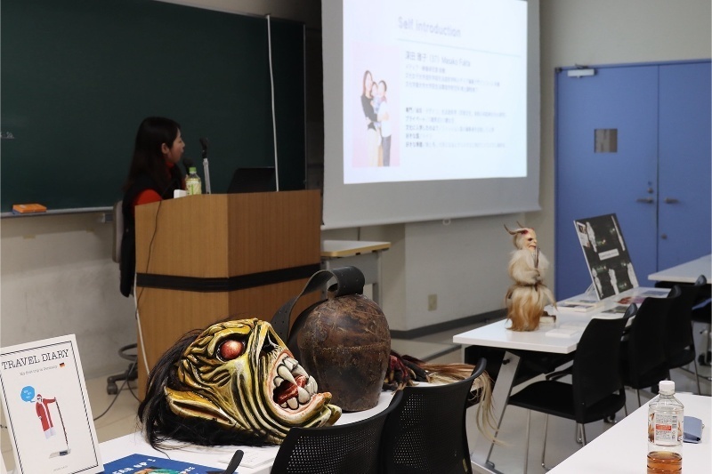 授業ではクランプスのほかに多くの漫画やゲームに影響を与えてきた北欧神話やハロウィンの由来であるアイルランド民話を紹介し、クリエイティブな世界との繋がりについて考察しました。また日本における昨今の鬼ブームについても触れました。後半は現地オーストリアで撮影したクランプスパレードの映像とともに、吉田氏からお借りした仮面、鞭、グローブ、カウベルを紹介。その大きさと重厚感から日本と海外の表現の違いがはっきりと伝わりました。最後に学生と教員が仮面を被り、カウベルを持って教室内をパレードする実演を行いました。クランプスが持つ迫力を肌で感じる貴重な時間となりました。