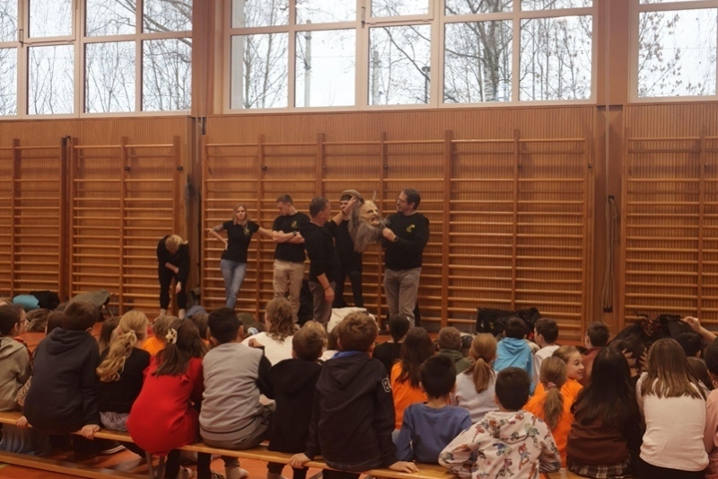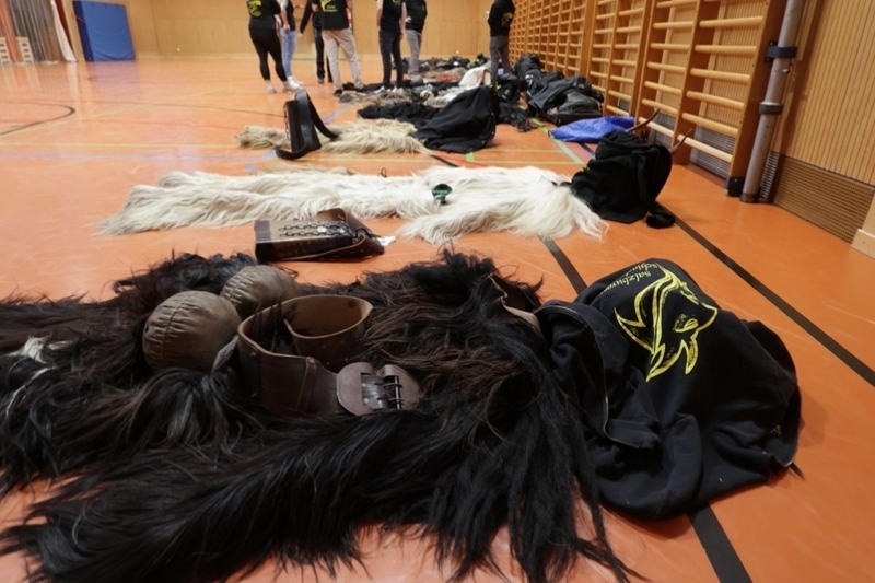 ザルツブルクに拠点を置く団体「Salzburger Schiachpercht'n und Krampusse」に協力いただき、12月6日「聖ニコラウスの日」に関連するクランプスのイベントに同行した。初日はザルツブルク中央駅にほど近い小学校で行われるワークショップを見学した。メンバーが体育館で衣装を広げて準備をしていると、子供達が覗き込んできて「クランプス!」という元気な声が響いた。ザルツブルクの子供達にとってクランプスは、このシーズン様々な場所(通りやショッピングモールなど)で目にするお馴染みの存在なのだ。子供たちが会場に入ってくると早速レクチャーが始まった。「衣装は何でできていると思う?馬?羊?」「匂いを嗅いでみる?」「仮面の中にはクッションがあるんだ。視界が狭いから急に目の前に飛び出したらぶつかってしまうので気をつけて」といった説明がされた。「質問がある人」と問い掛ければたくさんの手があがる。全ての仮面と衣装を紹介したあとは着用の流れを紹介。仮面を装着した瞬間、クランプスになりきったメンバーが子供たちに向かってポーズを取り会場は大興奮。最後は子供たちが各々着てみたい衣装の前に一列に並んだ。大人用の大きな衣装をずるずる引きずって仮面を装着したアンバランスな姿が可愛らしかった。仮面をつけて友達を驚かす子もいた。